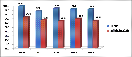 從更長的時間來看,2009年以來,石油加工行業的物流成本水平總體上呈現下降趨勢,相對于2009年的7.3%,2013年物流費用率下降了0.9個百分點。