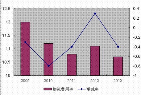 在鋼鐵行業產能過剩的大背景下,行業物流效率穩步提升,鋼鐵物流費用率有所下降。重點企業物流統計調查數據顯示,2013年鋼鐵行業物流成本費用率為10.7%,同比下降0.4個百分點,較2009年下降了1.3個百分點,為近年來的最低水平。