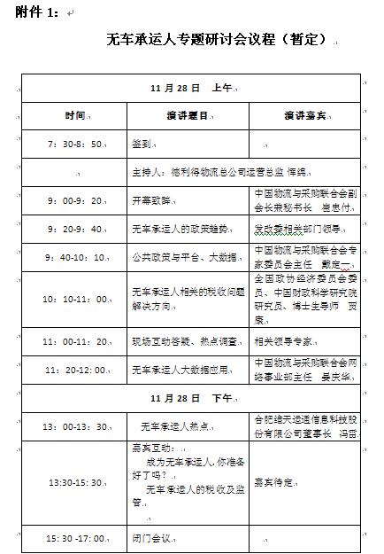 為了更好的貫徹落實《意見》的精神,進一步推動無車承運人的發展,我會決定于11月28日在北京召開“無車承運人專題研討會”,就涉及無車承運人的有關政府監管、增值稅征收、誠信建設以及數據備證等議題進行研討。現就有關事項通知如下: