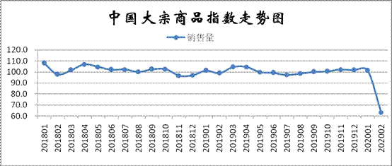 2020年2月份,大宗商品銷售指數大幅下跌37.9個百分點,至63.3%,顯示隨著新冠肺炎疫情的擴散,各地延遲復工復產,大宗商品市場需求顯著下滑,商品銷售嚴重受阻。中下旬以來,國內已經逐步進入復工階段,但企業實際的生產恢復節奏仍然較慢,下游企業基本都存在員工復崗緩慢、物流不暢以及新增訂單有限等情況,導致企業開工率普遍不高,市場需求的回升空間也較為有限。從各主要商品的銷售情況來看,本月各商品銷售量和上月相比降幅均超20%以上,其中鐵礦石和汽車銷售量降幅達到45%左右。