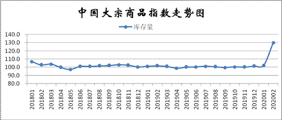 2020年2月份,大宗商品庫存指數為130.0%,較上月大幅上升27.8個百分點,顯示由于終端市場需求減少,加之受疫情影響商品流通企業復工復產普遍不足,物流運輸嚴重受阻,導致商品庫存迅速累積,部分商品甚至出現脹庫的現象。從各主要商品來看,本月各商品庫存均呈現激增的態勢,庫存量和上月相比增幅均超一成以上,其中鋼鐵和汽車庫存增量接近五成、有色金屬的庫存增量超過三成。