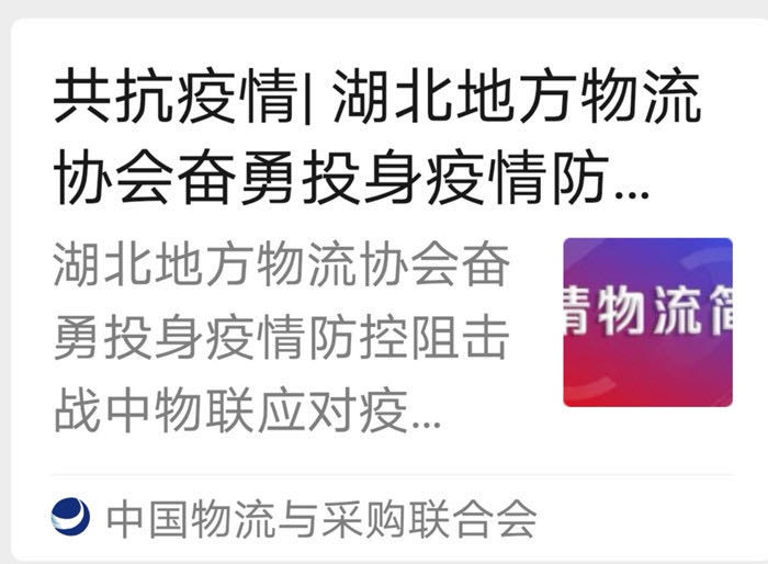 2月14日,中國物流與采購聯(lián)合會應對疫情工作領導小組工作簡報《湖北地方物流協(xié)會奮勇投身疫情防控阻擊戰(zhàn)中物聯(lián)應對疫情工作》,對湖北省物流協(xié)會行業(yè)抗疫行動,作了以下表述: