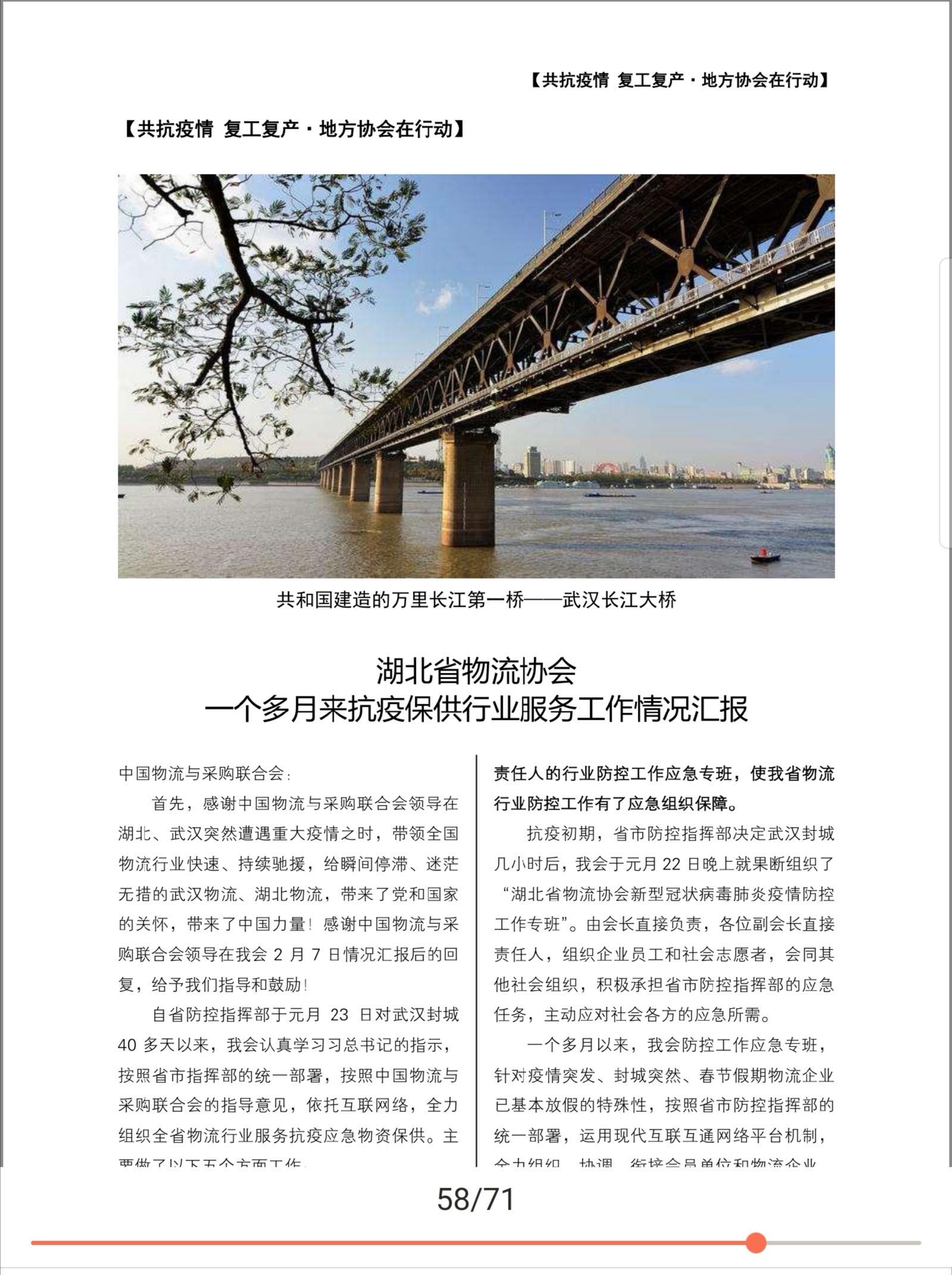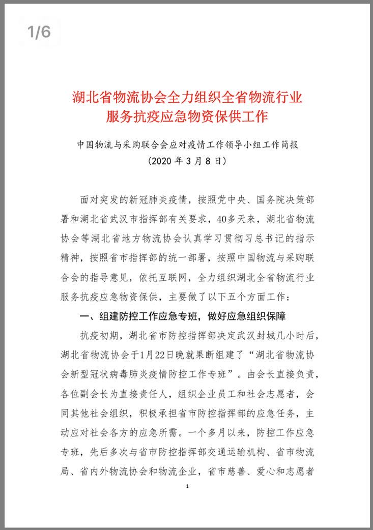 中國物流與采購聯(lián)合會2020年《會員通訊》第5期,在“共抗疫情、復工復產(chǎn)地方協(xié)會在行動”欄目P56,全文刊發(fā)《湖北省物流協(xié)會一個多月來抗疫保供行業(yè)服務工作情況匯報》。