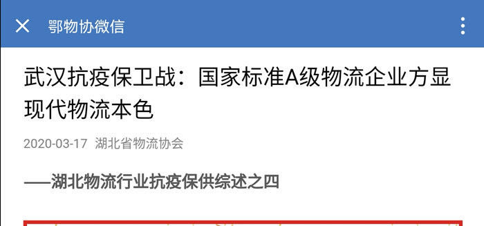3月17日,湖北省物流協(xié)會在“鄂物協(xié)微信”以湖北物流行業(yè)抗疫保供綜述形式,刊發(fā)微信《武漢抗疫保衛(wèi)戰(zhàn):國家標準A級物流企業(yè)方顯現(xiàn)代物流本色》。