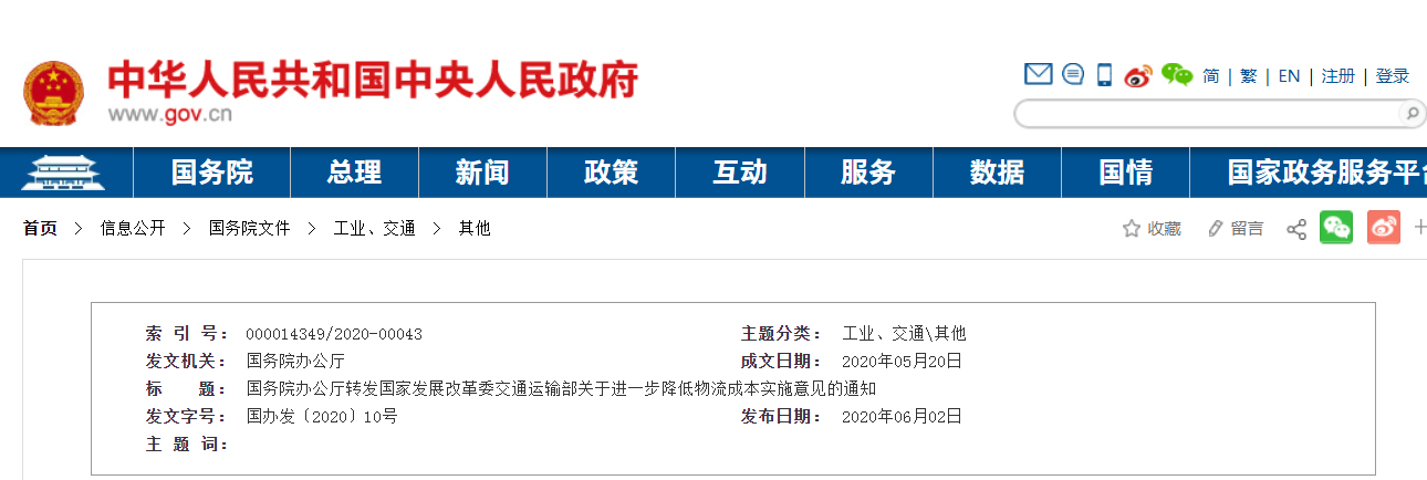 交通運輸部關于進一步降低物流成本實施意見的通知