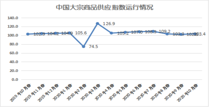 由中國物流與采購聯合會調查、發布的2020年10月份中國大宗商品指數(CBMI)為103.3%,較上月上升1.0個百分點。各分項指數中,供應指數止跌反彈、銷售指數繼續上升,庫存指數仍在下跌。從指數的變化情況來看,本月指數止跌反彈,且供需雙側聯動上升,供需兩旺,特別是需求旺季持續發力,消費端增速快于供應端,市場運行穩中向好,整體表現符合預期。