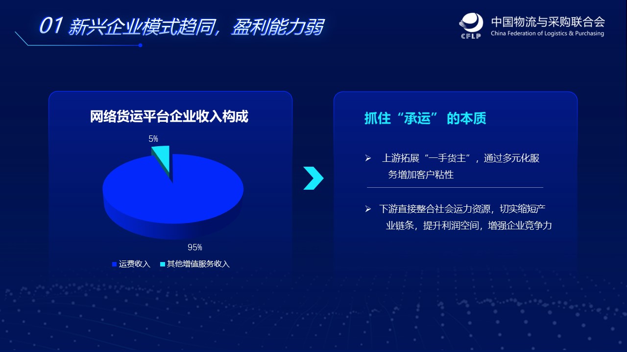據(jù)中物聯(lián)平臺(tái)分會(huì)統(tǒng)計(jì),網(wǎng)絡(luò)貨運(yùn)平臺(tái)企業(yè)的運(yùn)費(fèi)收入占平臺(tái)總營(yíng)業(yè)收入的平均比例為95%,收入構(gòu)成過(guò)于簡(jiǎn)單,且90%以上的企業(yè)未實(shí)現(xiàn)有效盈利,說(shuō)明在網(wǎng)絡(luò)貨運(yùn)業(yè)態(tài)下運(yùn)輸服務(wù)的利潤(rùn)空間依然很小。企業(yè)在經(jīng)營(yíng)過(guò)程中應(yīng)抓住承運(yùn)的本質(zhì),發(fā)揮平臺(tái)整合資源的優(yōu)勢(shì),上游拓展“一手貨主”,通過(guò)多元化服務(wù)增加客戶粘性,下游直接整合社會(huì)運(yùn)力資源,切實(shí)縮短產(chǎn)業(yè)鏈條,提升利潤(rùn)空間,增強(qiáng)企業(yè)競(jìng)爭(zhēng)力。