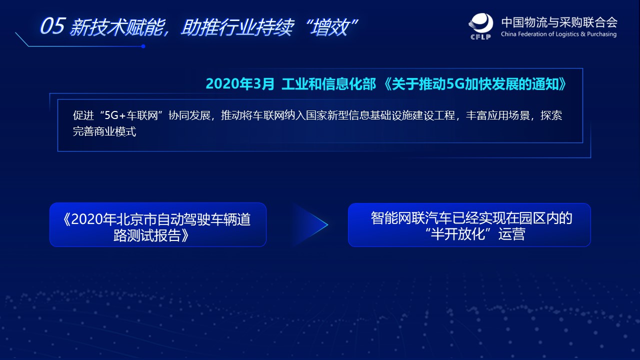 2020年3月,工業(yè)和信息化部印發(fā)《關(guān)于推動(dòng)5G加快發(fā)展的通知》,文件指出促進(jìn)“5G+車聯(lián)網(wǎng)”協(xié)同發(fā)展,推動(dòng)將車聯(lián)網(wǎng)納入國(guó)家新型信息基礎(chǔ)設(shè)施建設(shè)工程,豐富應(yīng)用場(chǎng)景,探索完善商業(yè)模式。在此背景下,今年2月,《2020年北京市自動(dòng)駕駛車輛道路測(cè)試報(bào)告》發(fā)布,多家企業(yè)開(kāi)放道路測(cè)試,智能網(wǎng)聯(lián)汽車已經(jīng)實(shí)現(xiàn)在園區(qū)內(nèi)的“半開(kāi)放化”運(yùn)營(yíng)。相信在不久的將來(lái),智能網(wǎng)聯(lián)等新技術(shù)的應(yīng)用一定會(huì)滲透到物流作業(yè)的各個(gè)環(huán)節(jié),為提升物流行業(yè)整體效率提供的源源不斷的動(dòng)力。