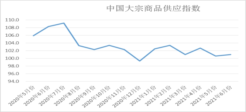 2021年6月份,大宗商品供應指數仍處上漲通道,為101.0%,較上月上升0.4個百分點,顯示國內大宗商品整體供應量仍在增長。從各主要商品來看,鐵礦石供應量受產量和到貨量增加的影響,繼續增加,且增速加快;成品油供應量止跌回升;鋼鐵和化工供應量繼續增加,但增速較上月所有減緩;煤炭和汽車供應量繼續下降;有色金屬供應量時隔十五個月后,再度出現總量下降的格局。