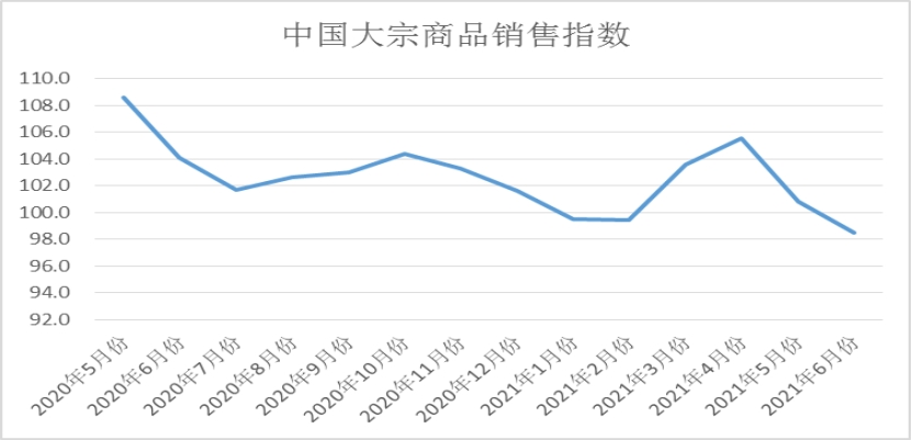 2021年6月份,大宗商品銷售指數為98.5%。銷售量在連續三個月呈現增長態勢以后,本月出現回落,說明本月市場需求減弱,特別是隨著商品價格出現震蕩回調,市場恐慌情緒加重,終端企業采購越發趨于謹慎,市場訂貨積極性明顯降低,成交明顯減弱,商品生產供應企業訂單組織壓力加大。各主要商品中,煤炭和成品油銷售量繼續增加,有色金屬和化工銷售量均時隔十五個月后再現下降格局,鋼鐵、鐵礦石和汽車銷售量則繼續下挫。