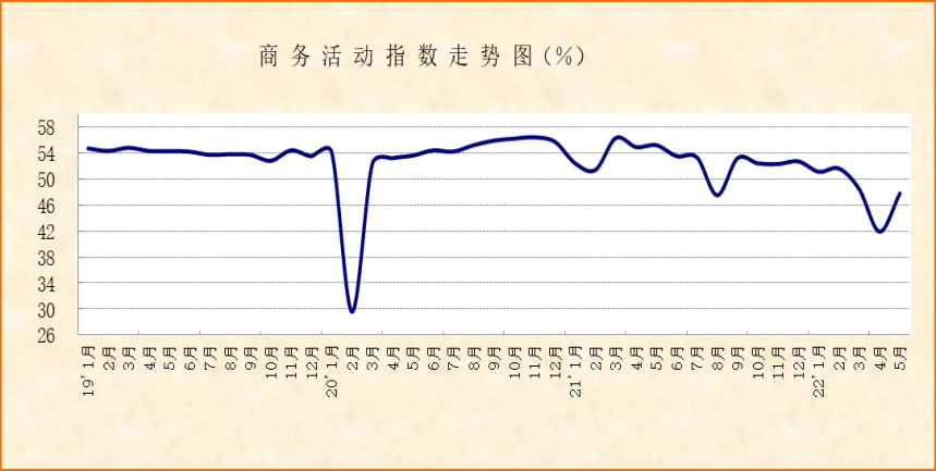 中國物流與采購聯(lián)合會、國家統(tǒng)計局服務(wù)業(yè)調(diào)查中心發(fā)布的2022年5月份中國非制造業(yè)商務(wù)活動指數(shù)較上月上升5.9個百分點至47.8%;新訂單指數(shù)較上月上升6.7個百分點至44.1%。綜合指數(shù)變化,隨著疫情防控形勢逐步好轉(zhuǎn)和相關(guān)扶持政策的持續(xù)推動,5月份非制造業(yè)供需活動較上月有所恢復(fù),但指數(shù)水平均低于50%,且低于2021年同期,非制造業(yè)恢復(fù)力度仍有待加強。
