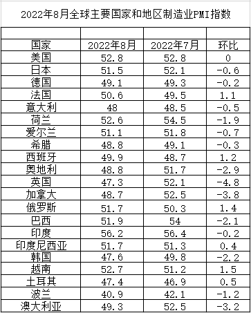 2022年8月全球主要國家制造業PMI