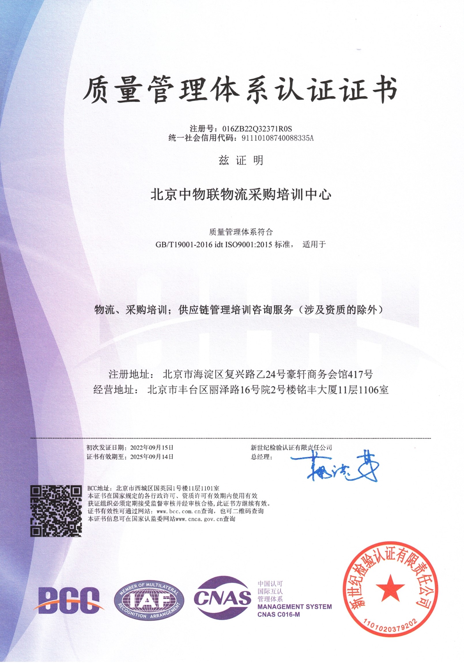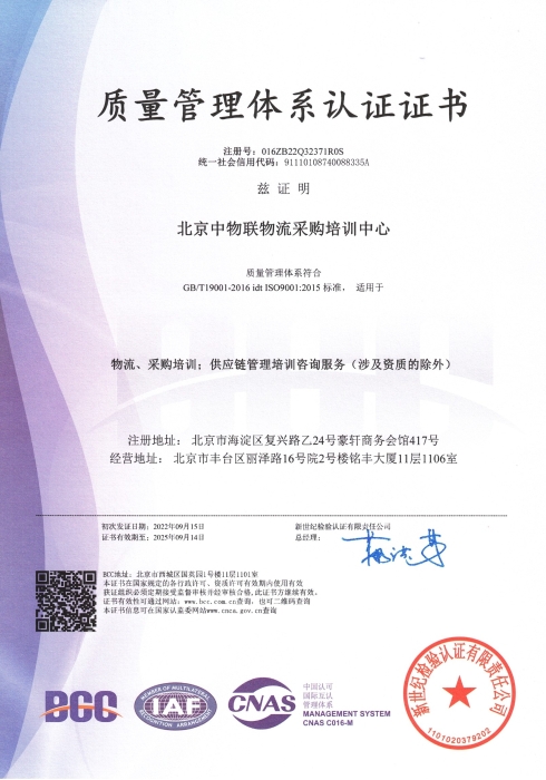 近日,北京中物聯物流采購培訓中心(以下簡稱北京中物聯)通過了ISO9001質量管理體系認證,認證范圍包括物流、采購培訓、供應鏈管理培訓咨詢服務等。北京中物聯是首個通過ISO9001質量管理體系認證的國家級行業協會培訓中心,這標志著北京中物聯在物流、采購與供應鏈培訓認證領域的管理體系上達到了國際標準,在質量管理、系統建設和規范化管理等方面取得了新進展。未來北京中物聯將繼續為行業提供更好的培訓認證產品與服務。