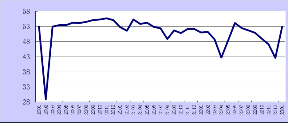 其中,2023年1月份,制造業生產指數為49.8%,較上月上升5.2個百分點;非制造業商務活動指數為54.4%,比上月上升12.8個百分點。