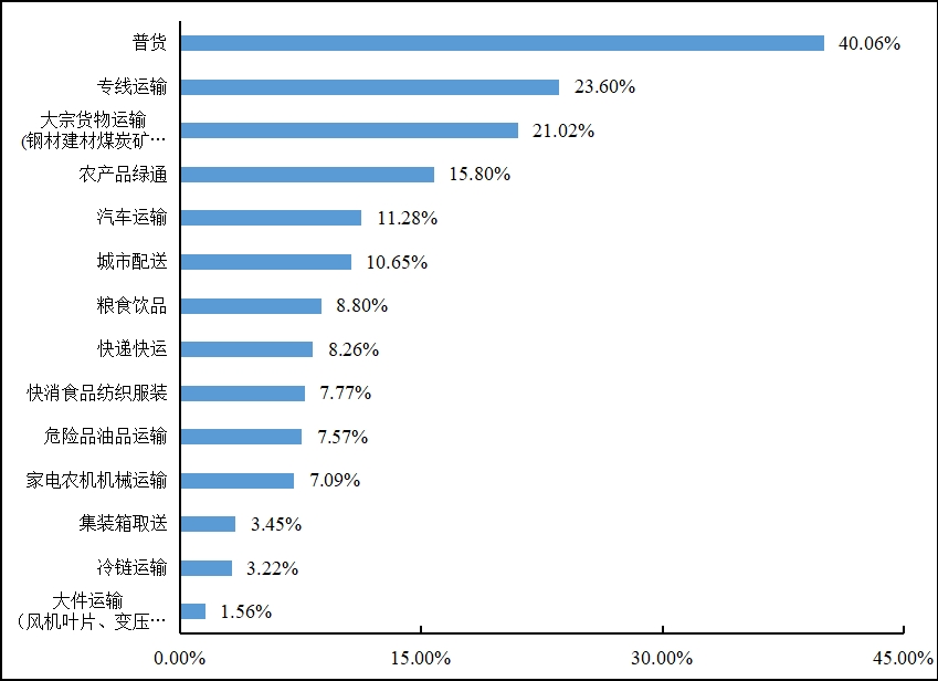 普貨運輸仍然貨運物流主要市場。調查顯示,被調查貨車司機主要以普貨運輸為主,占比為40.06%。