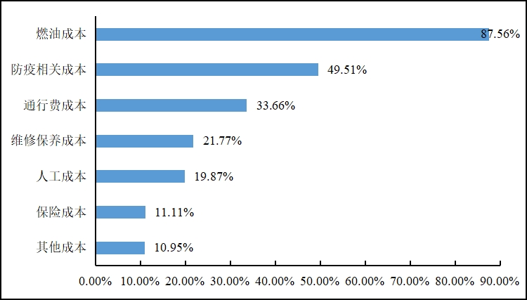 分析車輛行駛單位成本變化的原因,87.56%的貨車司機表示最主要原因是燃油成本。受國際能源供應緊張影響,2022年上半年油價快速上漲,全年均價較上年上漲將近三成,大幅推高車輛行駛成本。其次,認為防疫相關成本推高成本的貨車司機占比為49.51%。疫情期間,車輛停駛、倉庫封閉、人員隔離、防疫投入等情況較為普遍,大大增加了疫情防控相關的成本消耗。33.66%的貨車司機認為通行費成本推動單位成本增加。由于貨源不穩定增加車輛空駛,隨著高速公路通行費按車型(軸)收費,空車運輸以及單程運輸導致通行費用增加。