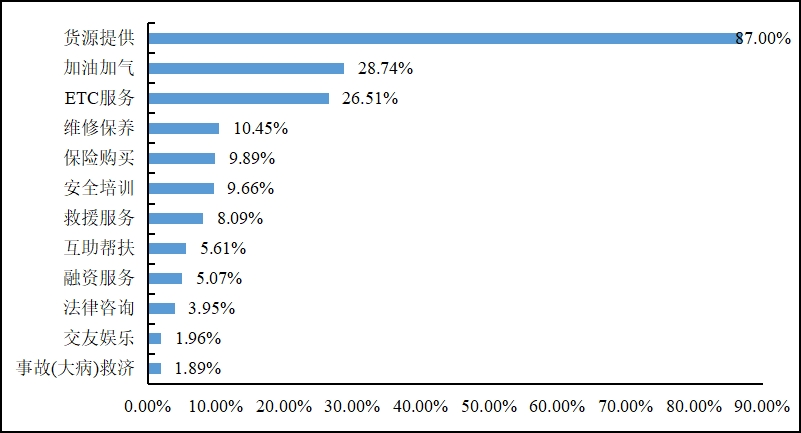 貨源提供仍是平臺提供的最主要服務。調查數據顯示,87%的貨車司機反映使用貨運互聯網平臺的服務是貨源提供。隨著司機逐步養成使用平臺的習慣,平臺數字化服務逐步拓展。包括加油加氣、ETC服務、維修保養等服務分別有28.74%、26.51%、10.45%的司機反映已經享受。