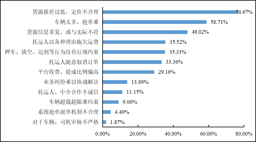 調查數據顯示,76.67%的貨車司機認為存在貨源報價過低,定價不合理問題,這仍是平臺面臨的最主要問題。其次是供需不平衡問題,58.71%的司機反映平臺上車輛太多、搶單難。再次是托運人誠信問題,48.02%的貨車司機反映平臺上貨源信息重復,有些信息與真實情況并不相符;35.52%的貨車司機反映托運人以各種理由拖欠運費;35.33%的司機反映押車、放空、遲到等行為沒有行規約束;33.36%的司機反映托運人存在隨意取消訂單行為。