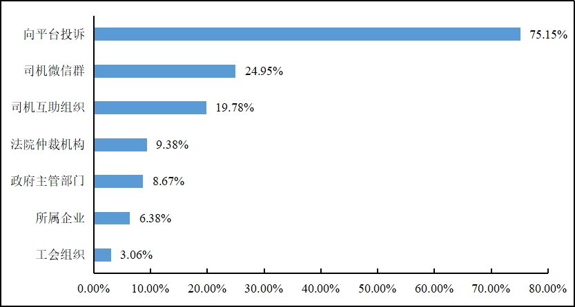向平臺投訴是司機最主要的糾紛處理方式。75.15%的貨車司機發生糾紛后選擇通過平臺客服渠道進行投訴。大部分平臺也建立了完整的客戶糾紛解決機制,平臺協調糾紛解決能力逐步提升。也有部分司機會選擇向加入的司機微信群、司機互助組織等自組織求助。選擇法律程序、政府部門、工會組織投訴的占比較低,分別為9.38%、8.67%和3.06%。
