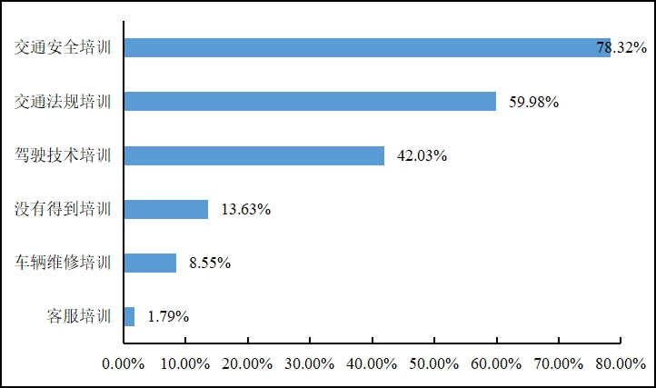 據調查數據顯示,86.37%的貨車司機參與了不同單位組織的不同內容的培訓活動。其中,參加交通安全培訓的貨車司機占比最多,達到78.32%。其次,有59.98%的貨車司機參加關于交通法規的培訓,42.03%的貨車司機參與駕駛技術方面的培訓,另外還有少部分貨車司機參與了車輛維修和客服方面相關內容的培訓。