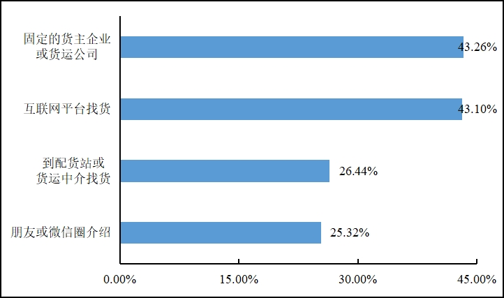 調查數據顯示,通過固定的貨主企業/貨運公司、互聯網平臺(網絡貨運平臺和交易撮合平臺)兩個渠道的貨車司機占比相當,均為43%左右。貨車司機貨源渠道逐步分化,線上攬貨日益普遍。還有25%左右的貨車司機通過到配貨站/貨運中介、朋友/微信圈介紹方式獲取貨源。
