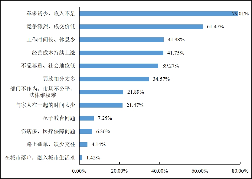 收入水平難以提高是貨車司機面臨的主要問題,79.01%的貨車司機認為存在車多貨少、收入不足;其次是市場競爭激烈,61.47%的司機認為供過于求,成交價低;第三是工作時間過長,41.98%的司機反映休息少,和家人聚少離多;第四是成本持續上漲,41.75%的司機反映成本上漲,難以保本;第五是社會地位低,39.27%的司機反映貨車司機不受尊重。