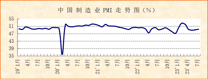 中國物流與采購聯合會、國家統計局服務業調查中心發布的2023年7月份中國制造業采購經理指數(PMI)為49.3%,較上月上升0.3個百分點,連續2個月平穩上升,顯示經濟趨穩向好運行。分項指數變化顯示,國內市場需求回升向好,企業生產持穩運行,市場價格趨升,民營經濟趨穩,企業預期普遍上升,經濟恢復向好積極因素增多。