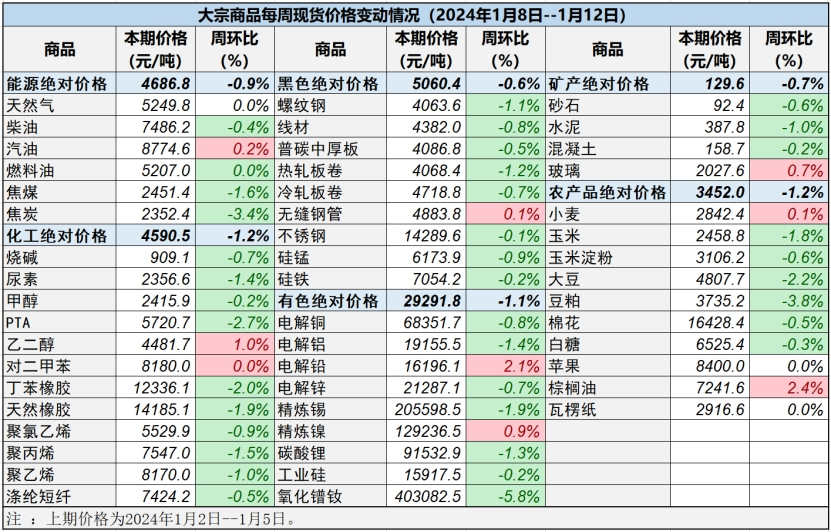 本表所示大宗商品價格(類別與產品規格說明見附表)為以人民幣計價的現貨價格(包含流通費用、利潤和稅費等)。計算這些價格時使用的信息來源,主要包括國內重點地區的生產商、貿易商及下游消費企業之間的成交、詢報盤及可成交價格。價格單位為人民幣元/噸。