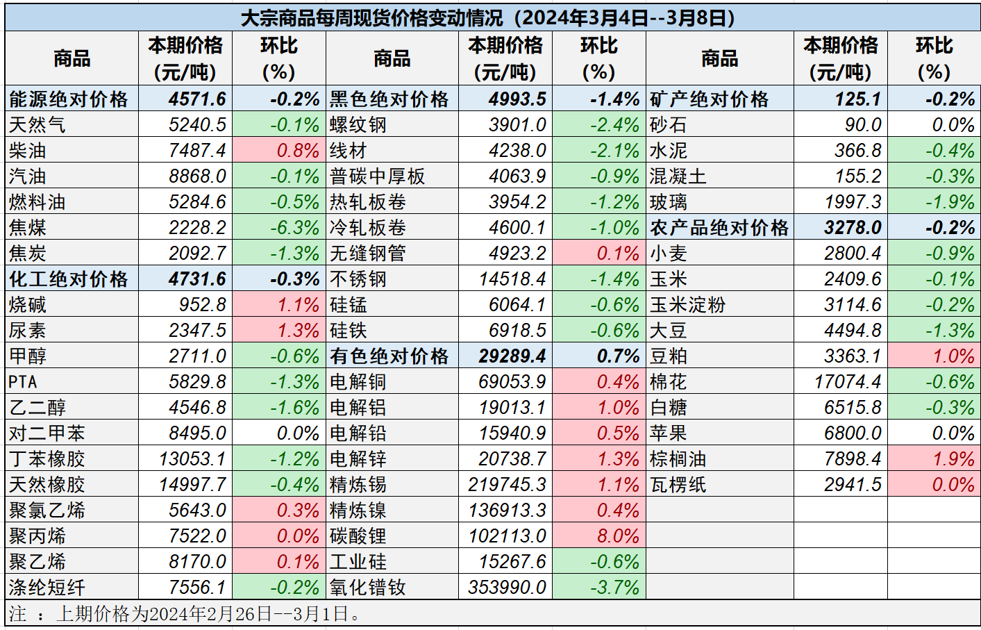 本表所示大宗商品價(jià)格(類(lèi)別與產(chǎn)品規(guī)格說(shuō)明見(jiàn)附表)為以人民幣計(jì)價(jià)的現(xiàn)貨價(jià)格(包含流通費(fèi)用、利潤(rùn)和稅費(fèi)等)。計(jì)算這些價(jià)格時(shí)使用的信息來(lái)源,主要包括國(guó)內(nèi)重點(diǎn)地區(qū)的生產(chǎn)商、貿(mào)易商及下游消費(fèi)企業(yè)之間的成交、詢(xún)報(bào)盤(pán)及可成交價(jià)格。價(jià)格單位為人民幣元/噸。