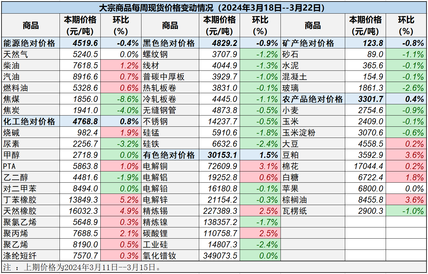本表所示大宗商品價(jià)格(類別與產(chǎn)品規(guī)格說(shuō)明見附表)為以人民幣計(jì)價(jià)的現(xiàn)貨價(jià)格(包含流通費(fèi)用、利潤(rùn)和稅費(fèi)等)。計(jì)算這些價(jià)格時(shí)使用的信息來(lái)源,主要包括國(guó)內(nèi)重點(diǎn)地區(qū)的生產(chǎn)商、貿(mào)易商及下游消費(fèi)企業(yè)之間的成交、詢報(bào)盤及可成交價(jià)格。價(jià)格單位為人民幣元/噸。