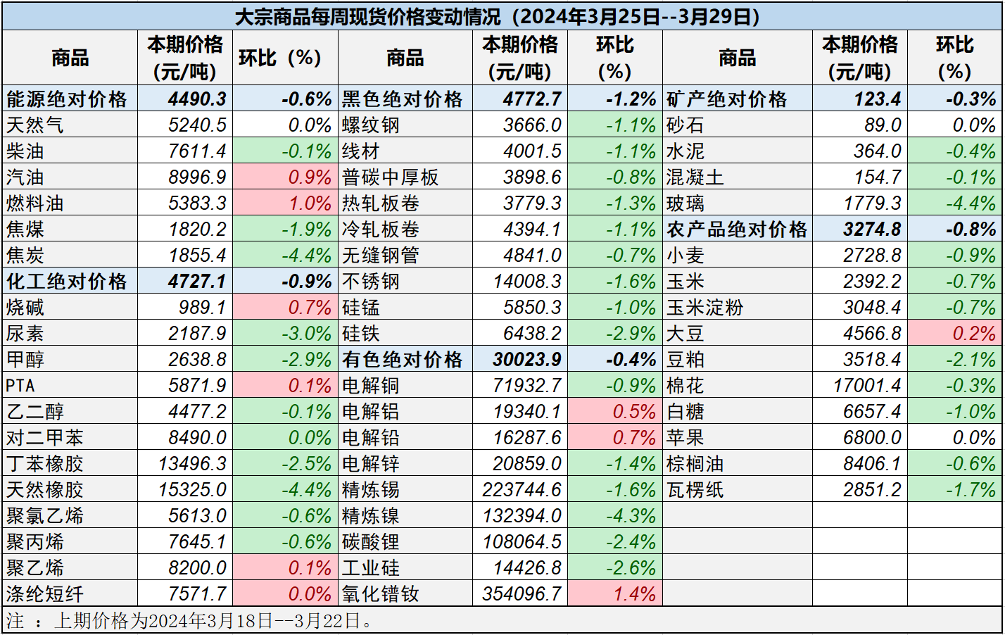 據(jù)中國物流與采購聯(lián)合會對全國50種重要大宗商品市場價格調(diào)查顯示,本期價格(2024年3月25日至3月29日)與上期價格相比,37種(占比74%)大宗商品價格下跌,10種(占比20%)價格上漲,3種(占比6%)價格持平。