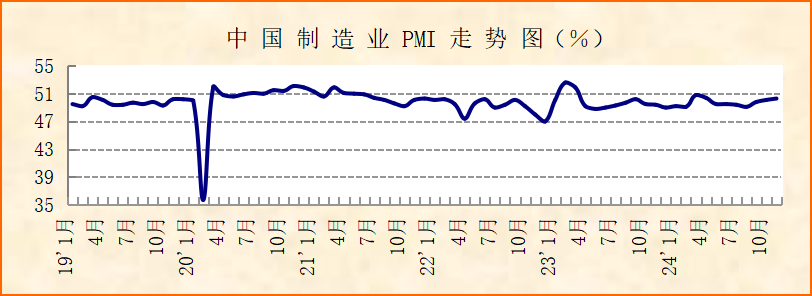 中國物流與采購聯合會、國家統計局服務業調查中心發布的2024年11月份中國制造業采購經理指數(PMI)為50.3%,較上月上升0.2個百分點,連續3個月上升,且連續2個月運行在擴張區間。主要分項指數中,新訂單指數、生產經營活動預期指數、采購量指數上升明顯,生產指數穩中有升,四個主要指數達到近7個月高點。綜合來看,積極變化繼續積聚,市場供需穩中加快增長,新動能和消費品制造業較快上升,大型企業持穩運行,中小企業有所改善,企業預期加快上升,經濟穩定向好回升態勢進一步確立。