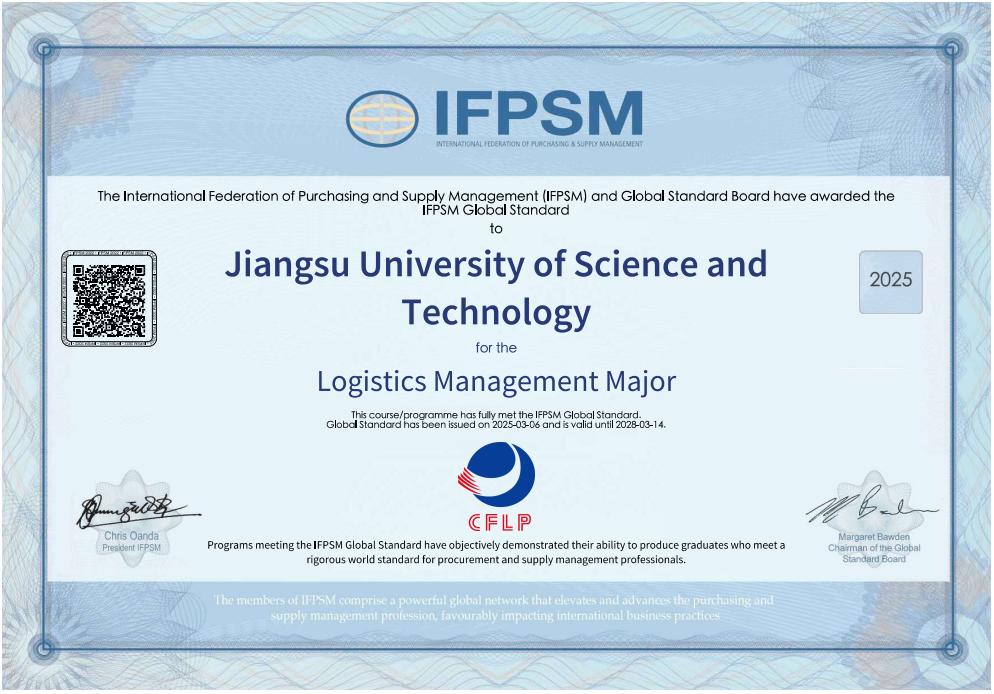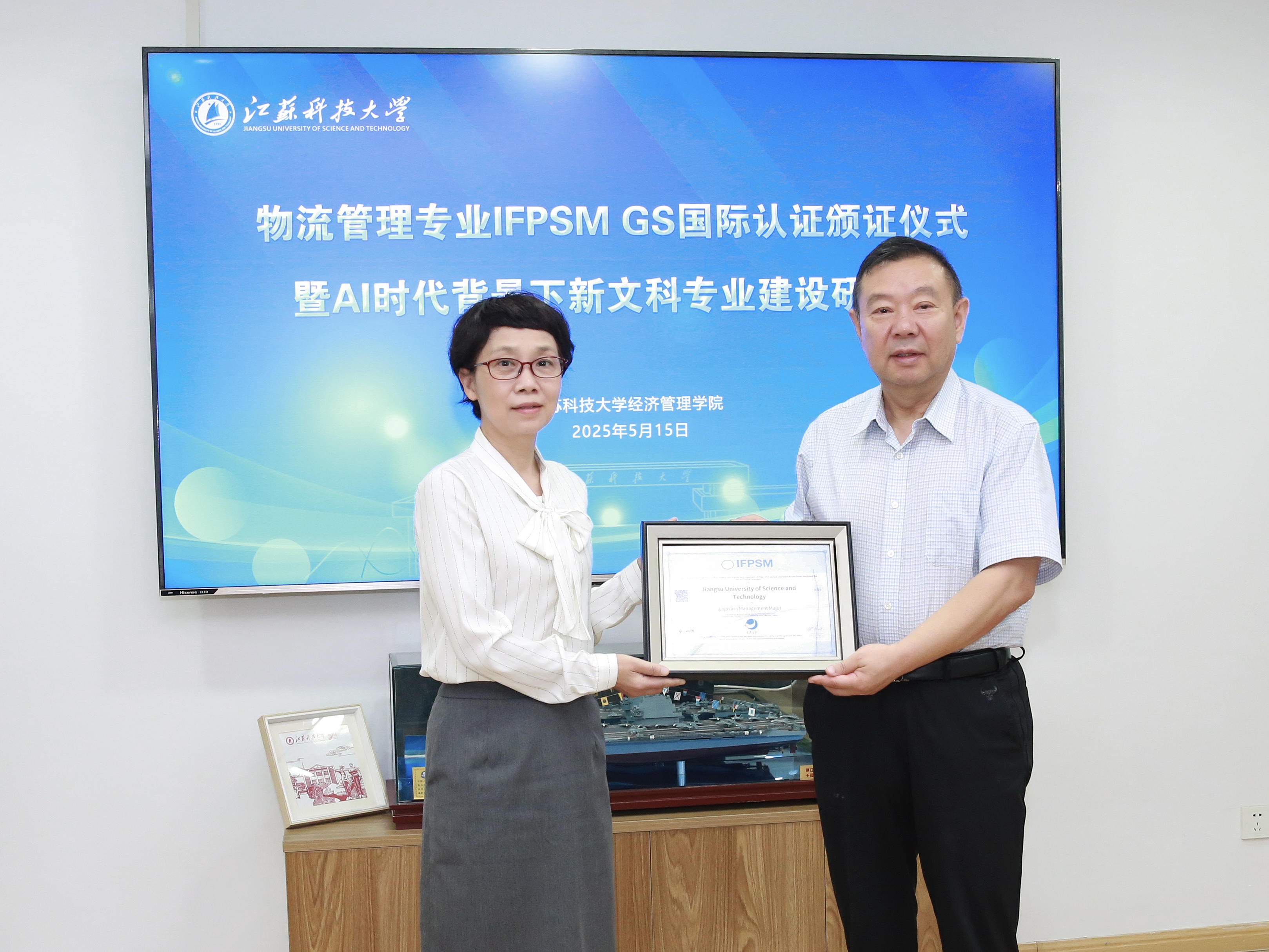 2025年5月15日,江蘇科技大學(xué)物流管理專業(yè)IFPSM GS國際認(rèn)證頒證儀式暨AI時代背景下新文科專業(yè)建設(shè)研討會在江蘇科技大學(xué)舉行。中國物流學(xué)會會長任豪祥、副會長兼秘書長郭肇明,國際采購與供應(yīng)管理聯(lián)盟(IFPSM)執(zhí)行助理Saana、江蘇科技大學(xué)黨委常委、副校長任南及學(xué)校領(lǐng)導(dǎo)、專業(yè)教師出席儀式。儀式由江蘇科技大學(xué)經(jīng)濟管理學(xué)院院長王念新主持。