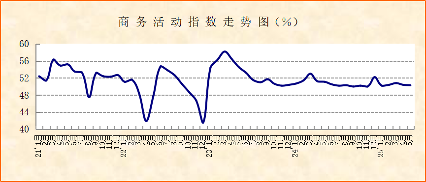 基建及水上運輸活動明顯回升。5月,隨著中美日內瓦經貿會談達成協議,基建相關海外需求和水上運輸相關需求得到釋放,帶動行業活動明顯回升。土木工程建筑業新出口訂單指數升至60%以上,環比升幅明顯,商務活動指數連續2個月上升,升至62%以上,顯示基礎建設相關海外需求集中釋放,并帶動基礎建設相關活動活躍趨升。水上運輸業商務活動指數升至60%以上,新訂單指數和新出口訂單指數均升至50%以上,顯示水上運輸供需活動集中釋放。