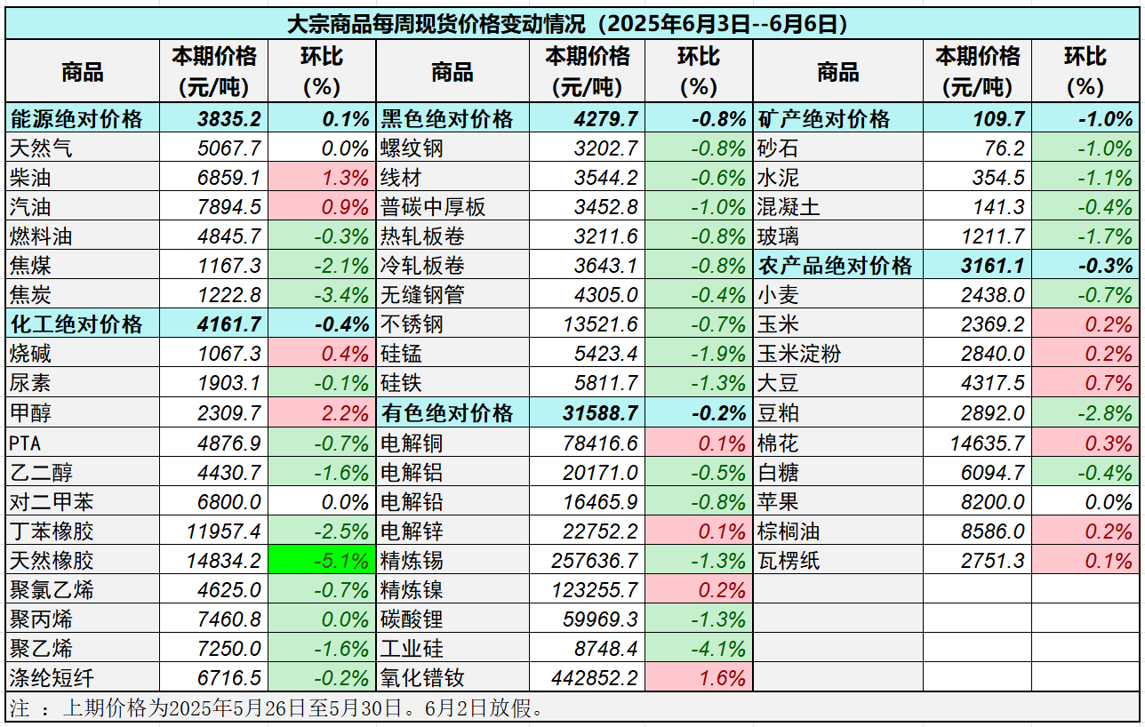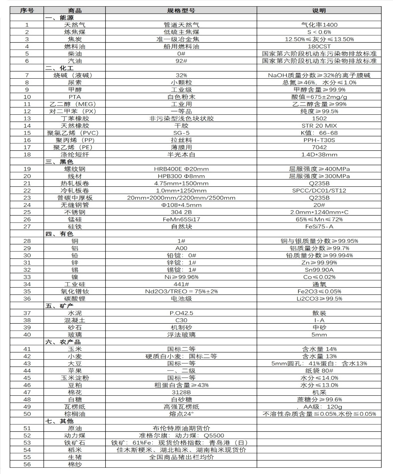 本表所示大宗商品價格(類別與產(chǎn)品規(guī)格說明見附表)為以人民幣計價的現(xiàn)貨價格(包含流通費用、利潤和稅費等)。計算這些價格時使用的信息來源,主要包括國內(nèi)重點地區(qū)的生產(chǎn)商、貿(mào)易商及下游消費企業(yè)之間的成交、詢報盤及可成交價格。價格單位為人民幣元/噸。