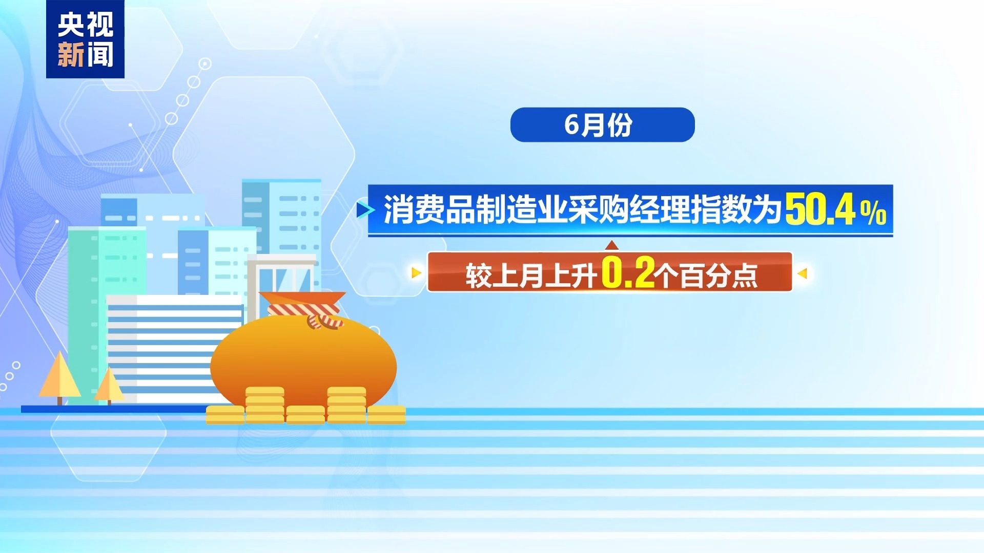 在一系列促消費政策的落實顯效下,消費品制造業也實現穩中有增。6月份消費品制造業采購經理指數為50.4%,較上月上升0.2個百分點。基礎原材料行業運行也有所回穩,基礎原材料行業采購經理指數較上月上升0.8個百分點,結束了連續3個月下行態勢。