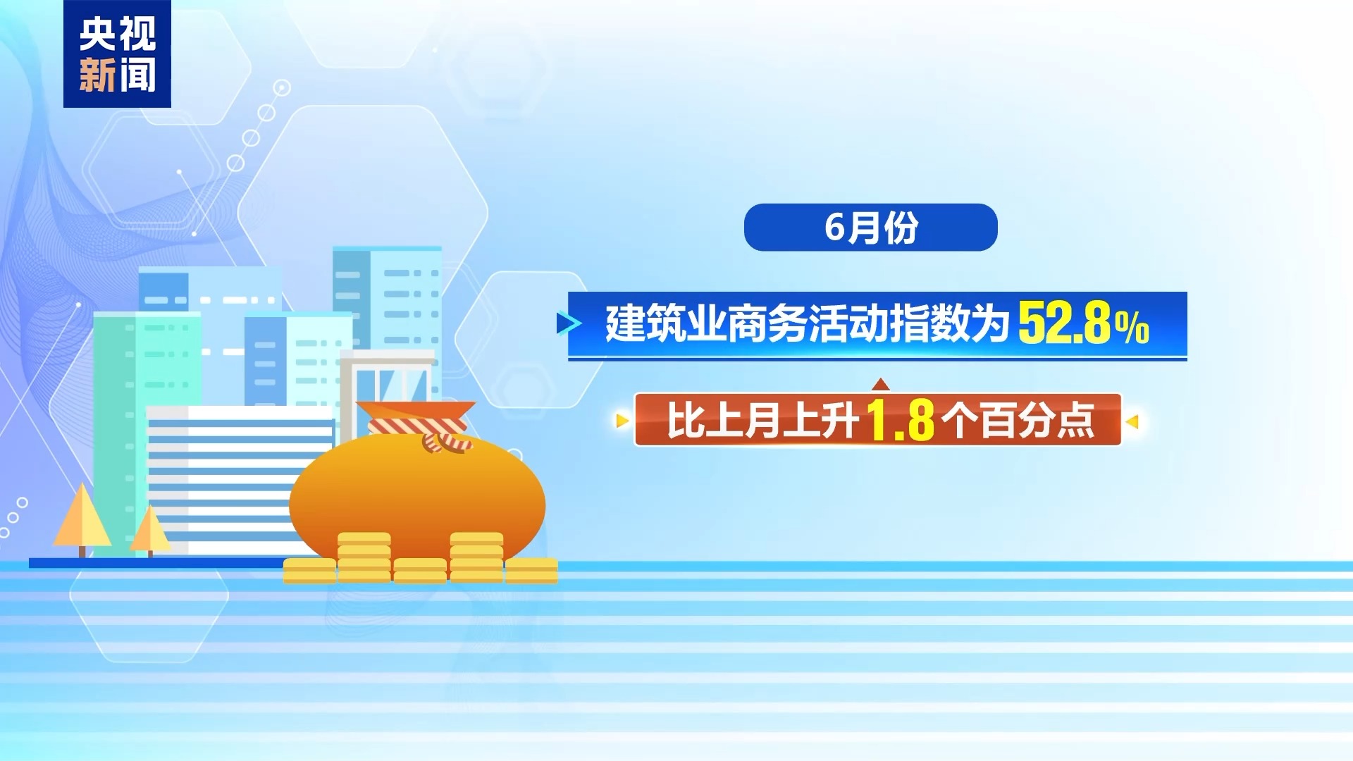 6月份建筑業商務活動指數為52.8%,比上月上升1.8個百分點,景氣水平有所回升。其中,土木工程建筑業商務活動指數為56.7%,連續三個月位于55%以上較高景氣區間,表明近期基礎設施項目建設保持較快施工進度。