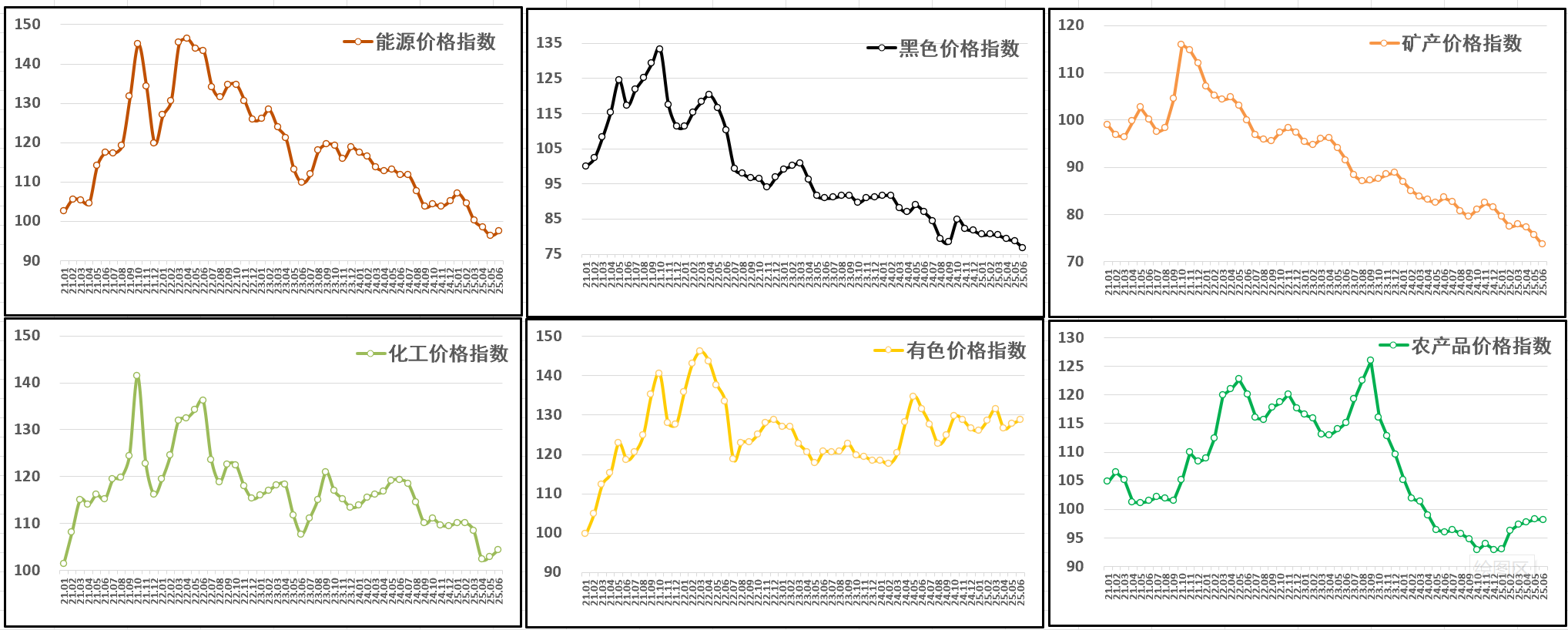 分行業看:化工價格指數繼續回升,報104.3點,月環比上漲1.4%,年同比下跌12.6%;有色價格指數延續漲勢,報128.8點,月環比上漲0.8%,年同比下跌2%;能源價格指數止跌反彈,報97.3點,月環比上漲1%,年同比下跌12.9%;農產品價格指數小幅回調,報98.1點,月環比下跌0.2%,年同比上漲2.2%;黑色價格指數延續弱市,報76.6點,月環比下跌2.6%,年同比下跌11.8%;礦產價格指數繼續走低,報73.6點,月環比下跌2.6%,年同比下跌11.9%。