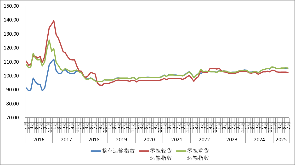 分車型指數(shù)看,各車型指數(shù)環(huán)比有所回落,同比去年保持增長。以大宗商品及區(qū)域運輸為主的整車指數(shù)為105.6點,比上月回落0.05%,比上年同期回升2.1%。零擔(dān)指數(shù)中,零擔(dān)輕貨指數(shù)為102.6點,比上月回落0.02%,比上年同期回升0.6%;零擔(dān)重貨指數(shù)為105.6點,比上月回落0.1%,比上年同期回升2.2%。