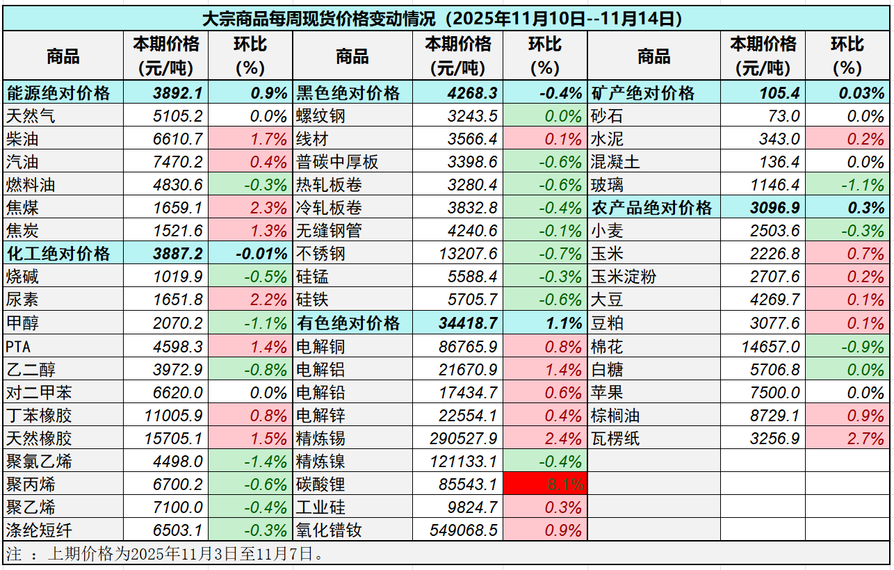 本表所示大宗商品價格(類別與產(chǎn)品規(guī)格說明見附表)為以人民幣計價的現(xiàn)貨價格(包含流通費用、利潤和稅費等)。計算這些價格時使用的信息來源,主要包括國內(nèi)重點地區(qū)的生產(chǎn)商、貿(mào)易商及下游消費企業(yè)之間的成交、詢報盤及可成交價格。價格單位為人民幣元/噸。