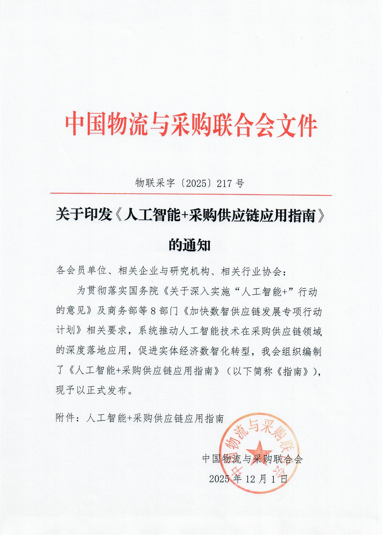 為貫徹落實國務院《關于深入實施“人工智能+”行動的意見》及商務部等8部門《加快數智供應鏈發展專項行動計劃》的有關部署,系統推進人工智能技術在采購與供應鏈領域的融合創新與規范發展,中國物流與采購聯合會(以下簡稱“中物聯”)于今日發布國內首個人工智能專項應用指南——《人工智能+采購供應鏈應用指南》(以下簡稱《指南》)。