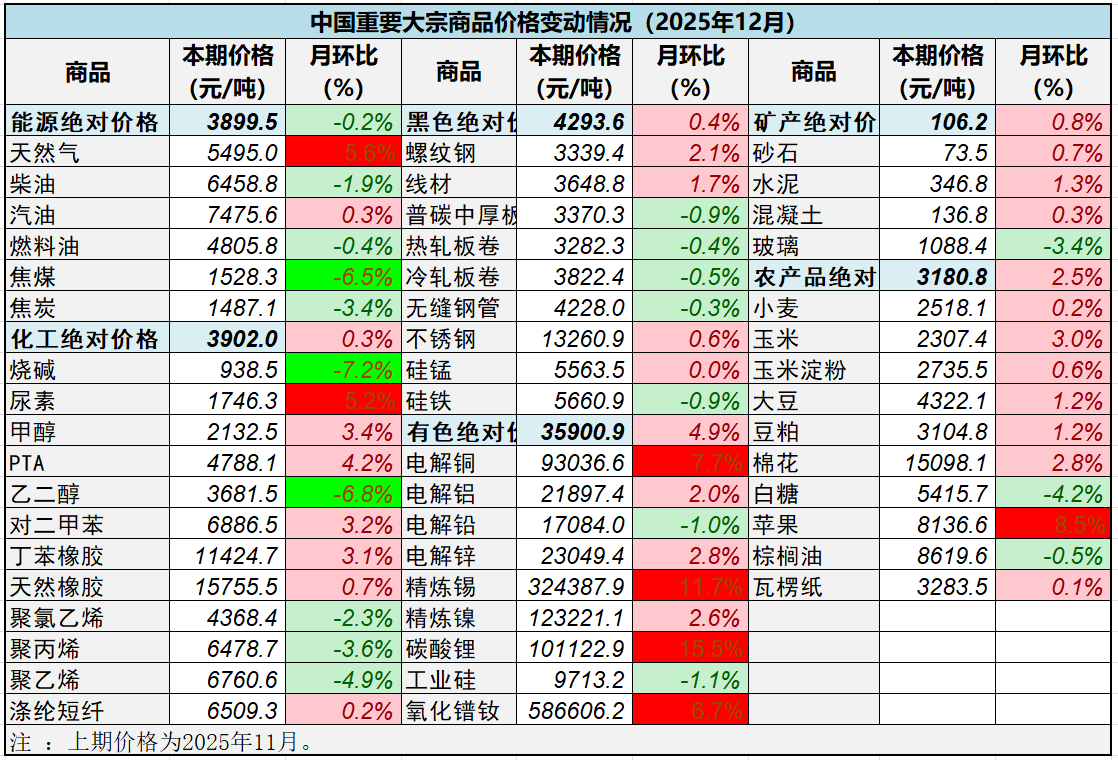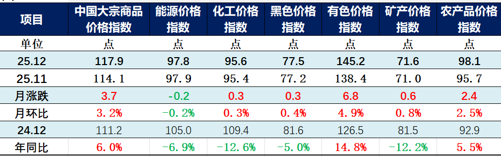 由中物聯大宗商品流通分會和上海鋼聯等單位聯合調查,中國物流與采購聯合會發布的2025年12月份中國大宗商品價格指數(CBPI)為117.9點,環比上漲3.2%,同比上漲6%。從指數運行情況來看,指數連續八個月環比回升,并創下自2024年6月以來新高,表明隨市場供需持續改善,企業對未來市場發展信心增強,預期向好,大宗商品市場景氣水平繼續回升,經濟內生增長動能進一步鞏固。展望2026年,盡管全球經濟復蘇仍面臨國際金融市場動蕩、國際貿易摩擦、地緣政治緊張等多重挑戰,但積極宏觀經濟政策將為國內經濟和大宗市場的持續恢復提供保障,同時中國經濟結構轉型升級步伐加快,也將創造新的大宗商品需求,大宗商品市場有望在固本培元中實現更高質量發展。