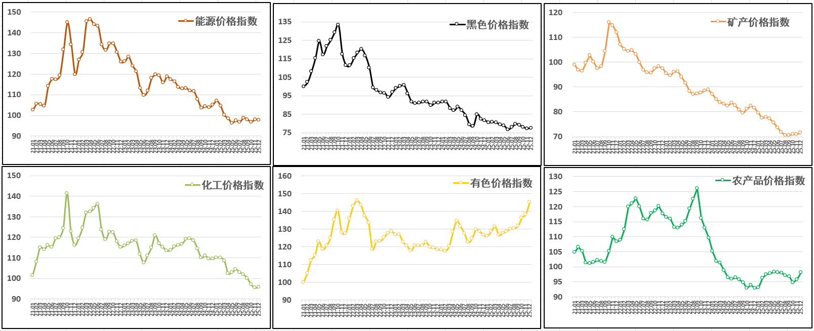 分行業看:有色價格指數大幅上漲,報145.2點,月環比上漲4.9%,年同比上漲14.8%;農產品價格指數漲幅擴大,報98.1點,月環比上漲2.5%,年同比上漲5.5%;礦產價格指數繼續回升,報71.6點,月環比上漲0.8%,年同比下跌12.2%;黑色價格指數止跌反彈,報77.5點,月環比上漲0.4%,年同比下跌5%;化工價格指數小幅上行,報95.6點,月環比上漲0.3%,年同比下跌12.6%;能源價格指數小幅走低,報97.8點,月環比下跌0.2%,年同比下跌6.9%。