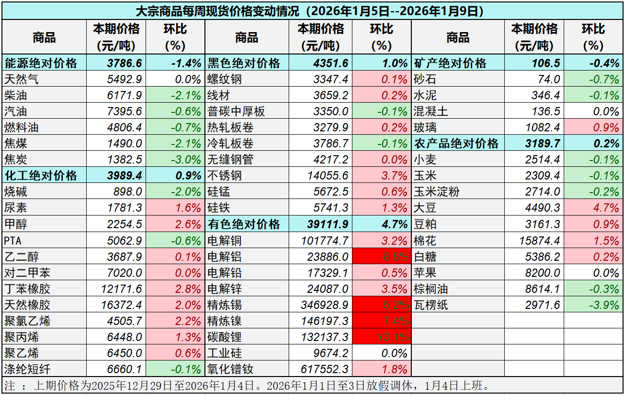 本表所示大宗商品價格(類別與產品規格說明見附表)為以人民幣計價的現貨價格(包含流通費用、利潤和稅費等)。計算這些價格時使用的信息來源,主要包括國內重點地區的生產商、貿易商及下游消費企業之間的成交、詢報盤及可成交價格。價格單位為人民幣元/噸。