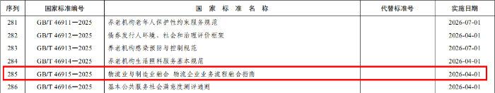 2025年12月31日,國家市場監(jiān)督管理總局、國家標(biāo)準(zhǔn)化管理委員會(huì)發(fā)布2025年第38號(hào)《軌道交通 牽引供電系統(tǒng) 電壓》等360項(xiàng)推薦性國家標(biāo)準(zhǔn)和14項(xiàng)推薦性國家標(biāo)準(zhǔn)修改單的公告,其中包括由全國物流標(biāo)準(zhǔn)化技術(shù)委員會(huì)提出并歸口的《物流業(yè)與制造業(yè)融合 物流企業(yè)業(yè)務(wù)流程融合指南》(GB/T 46915-2025)國家標(biāo)準(zhǔn)。