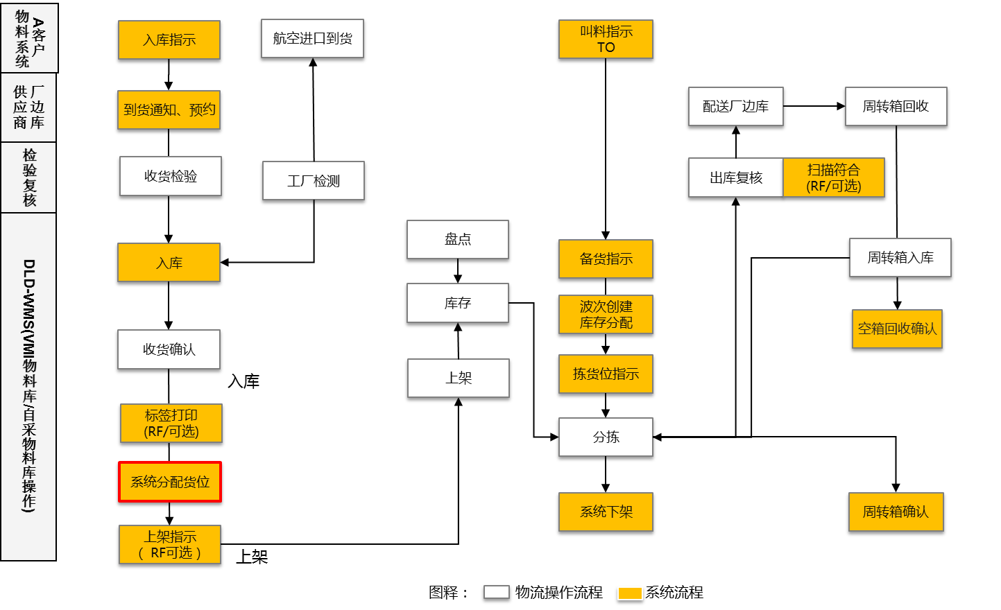 在這一階段德利得WMS與A客戶的物流管理系統進行了DEI對接,間接實現了與SPA系統的對接,實現了倉儲與出入庫操作的高效率與高準確率,滿足了物流倉庫向生產線供貨的客戶需求。