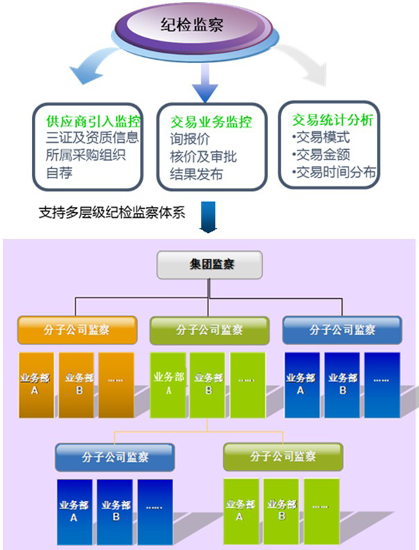有央企用戶在使用過程中提出紀委監察的需求,歐冶采購電子商務平臺研究后推出了“業務監察”功能,支持分級監管,實現對采購業務的供應商引入、網上交易等的在線實時監控和全過程監控管理,做到事前預防、事中控制、事后分析,為各級監查管理部門提供監管手段。