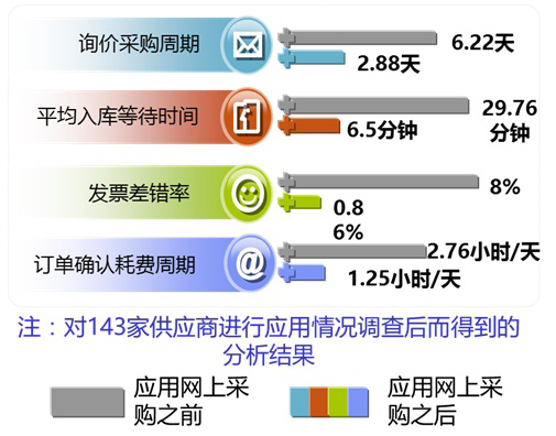 通過歐冶采購電子商務平臺的推動,供應鏈效率大幅提高,經對143家供應商進行應用情況調查后得到的結果顯示:詢價采購周期從6.22天降至2.88天,平均入庫等待時間從29.76分鐘縮短至6.5分鐘,發票差錯率從8%大幅降至0.86%,訂單確認耗費周期從2.76小時/天減半至1.25小時/天。