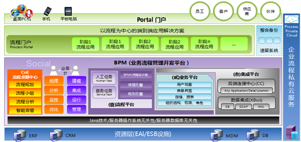 成熟先進的基于Java技術和Model Driven,MD模型驅動思想的業務流程快速開發、運營管理和應用集成的平臺。
