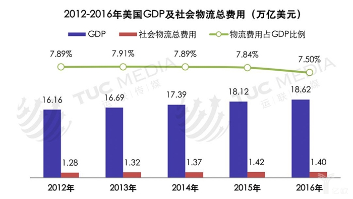 近幾年美國經(jīng)濟(jì)平穩(wěn),GDP呈現(xiàn)小幅度增長趨勢,社會物流總費用保持在GDP的8%左右并略微下降,表現(xiàn)較為平穩(wěn),物流市場規(guī)模短期內(nèi)不會出現(xiàn)大幅度變化。